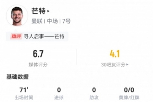 直播吧5月22日讯 正在进行的欧联杯决赛,曼联0-1热刺。此役芒特首发71分钟被换下,球员全场重点数据如下↓