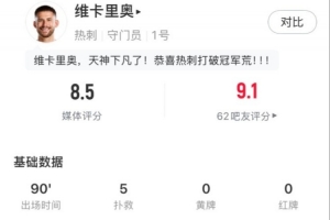 本场比赛热刺门将维卡里奥高接抵挡,全场比赛完成了5次扑救,赛后他也是获得了8.5分的全场最高评分。