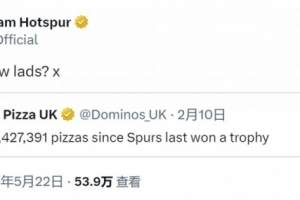 达美乐披萨英国官方社媒在今年2月份曾发文:“自从上次热刺赢得冠军以来,我们已经售出了78427391份披萨。”