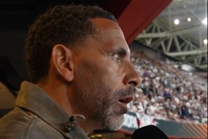 在约翰逊破门后,看台上的费迪南德目瞪口呆,而贝尔喜笑颜开鼓掌。