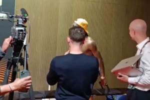 赛后比苏马赤裸上身、拖着行李箱唱着歌,走过媒体区,离开圣马梅斯球场。