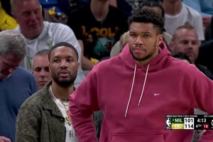 [字母哥&利拉德不甘] 看到球队比分落后,字母哥&利拉德在场边一脸愁容,眼神透露着不甘