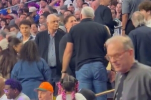 独行侠小股东库班与东契奇的父亲及经纪人打招呼