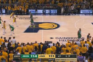 值得一提的是,上赛季步行者面对凯尔特人(东部决赛G3)曾使用这个战术,当时比分都一样,而且发球人也是同一个(安德鲁-内姆哈德),不过最后内史密斯的绝平三分球没投进。