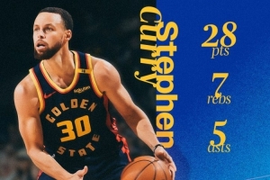 本场比赛,库里出战35分钟,20投8中,三分13中4,罚球9中8,拿到28分7板5助。