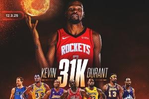 本场首节,杜兰特后仰跳投命中得到本场第4分,个人生涯得分突破31000分大关,成为NBA历史上第8位得分破31000的球员!