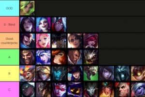 直播吧4月7日讯 职业选手Reptile 14.7版本下路英雄梯级排名公布,泽丽为T0,卡莎、金克丝、韦鲁斯为S级,小炮、卡牌、VN为C级。
