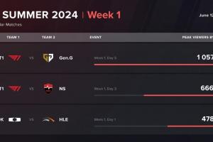 直播吧6月17日讯 外媒统计LCK夏季赛首周前三收视率,T1的两场BO3位列前二,第一名为T1对阵GEN的BO3。