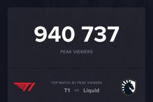 根据Esports Chart的统计,T1vsTL的比赛观众打到了940737人次,目前为本届石油杯最高。