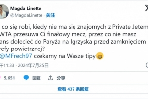 “嘿,如果你不认识拥有私人飞机的朋友,而WTA又推迟了你的决赛,你肯定来不及在禁飞前赶到巴黎,你会怎么办?”里内特在社交媒体上抱怨。