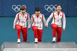 直播吧8月11日讯 乒乓球女子团体金牌赛,中国队直落三场以3-0的大比分击败日本队,夺得乒乓球女子团体金牌。赛后颁奖仪式,陈梦、孙颖莎、王曼昱手拉手登上了领奖台。