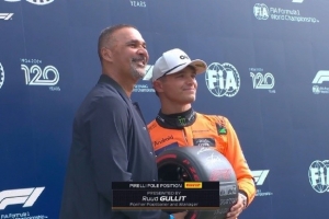 经过近一个月的夏休期,F1本周迎来荷兰大奖赛,在今天晚间结束的排位赛中,迈凯伦车手诺里斯获得杆位,古利特作为颁奖嘉宾为诺里斯颁奖。