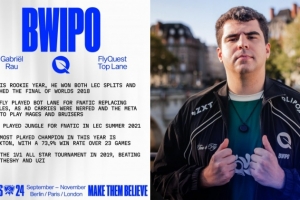 直播吧10月20日讯 2024全球总决赛淘汰赛1/4决赛今晚八点将迎来GEN对阵FLY的比赛,LoL Esports官方推特发布FLY上单Bwipo选手海报。