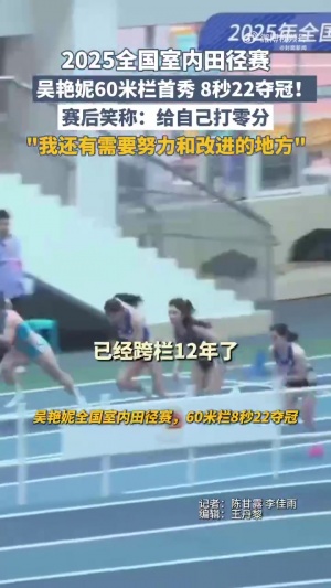 直播吧02月11日讯 今天上午进行的全国室内田径大奖赛成都站女子60米栏决赛,吴艳妮跑出8秒22夺冠(个人最好成绩8秒06)。