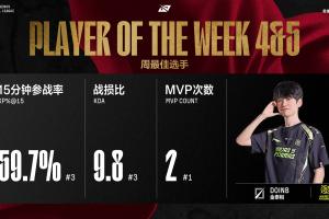 英雄联盟赛事官方发布了LPL第一赛段常规赛第四&第五周的最佳选手和最佳新秀,NIP中单Doinb斩获最佳选手,UP打野Junhao获得最佳新秀!