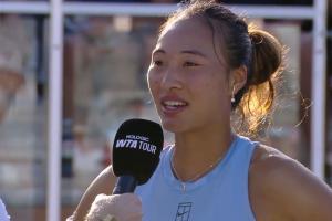直播吧04月04日讯 WTA500查尔斯顿站1/8决赛,郑钦文2-1战胜梅尔滕斯成功晋级8强。赛后,郑钦文接受采访。