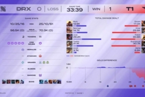 直播吧4月4日讯 LCK第二赛段T1对阵DRX,Gumayusi久违首发出战,烬砍下7-0-10完美数据;