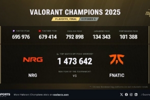 直播吧10月8日讯 据国外Esports Charts数据网站统计,瓦罗兰特巴黎全球总决赛的峰值观众为147w,不及CS2 Major和英雄联盟MSI。