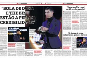 直播吧01月21日讯 2023迪拜环球足球奖颁奖典礼举行,C罗获得三项奖项:最佳中东球员、最佳射手、最受球迷欢迎奖。随后他接受了葡萄牙媒体《记录报》的专访。