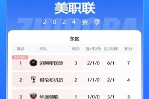 美职联积分榜:迈阿密国际3场2胜1平,7分领跑东区积分榜