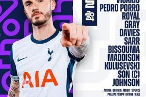 热刺首发:维卡里奥、波罗、埃默森、阿奇-格雷、本-戴维斯、帕普-萨尔、比苏马、麦迪逊、库卢塞夫斯基、孙兴慜、布伦南-约翰逊