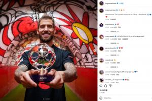 伊尼戈-马丁内斯在社交媒体上晒出自己手拿最佳奖杯的照片,并写道:“太棒了!巴萨再拿三分!”