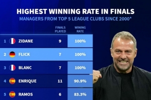直播吧4月29日讯 德国转会市场统计了本世纪五大联赛教练在决赛中的胜率,并列出榜单,齐达内、弗里克、布兰科胜率100%居首。