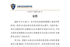 直播吧04月29日讯 云南玉昆发布公告,对主教练安德森给予3万元人民币罚款处罚,对新滇军球迷团体主要负责人处以禁止主场入场观赛3场处罚。