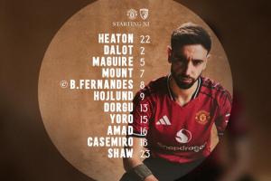 曼联首发:22-希顿、2-达洛特、5-马奎尔、15-约罗、23-卢克-肖、13-多古、18-卡塞米罗、7-芒特、8-B费、9-霍伊伦、16-阿玛德-迪亚洛