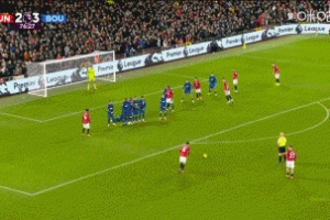 直播吧12月16日讯 英超第16轮,曼联主场迎战伯恩茅斯,比赛第77分钟,B费任意球直接破门,曼联3-3扳平比分。